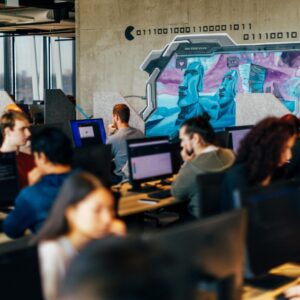 When we arrived at the 42 Paris campus, it was a construction zone, literally. They’re in the middle of replacing the original two-story building with a fancy high-rise, so everything was a bit chaotic. Eventually, we found our way to the BESS building, on the other side of the road, where the dorms used to be. Amidst the chaos, once we stepped into the make-shift clusters, converted from dorm rooms, what really caught my eye was the art scattered throughout the space, thanks to their ART42 project. As an art lover, I was thrilled to see students working in such a creatively inspiring environment.